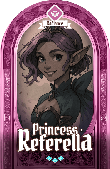 Referella, a tavern storyteller with striking purple hair and a hidden royal lineage, embodies both the rustic charm of the Tomeguard Territories and the scholarly prestige of Citehold. Abandoned as an infant to protect her from a sinister plot, she grew up among lorekeepers, unknowingly carrying the legacy of Citehold's throne. The Great Scattering revealed her ancestry and her latent power of radiance-her mystic tiara granting her deep insight into source material. Now, with allies by her side, she journeys to restore the Grand Archive, wielding knowledge as her greatest weapon against an uncertain future.