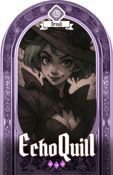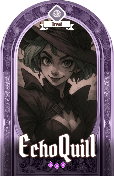 Once a gifted sorceress named Elara, EchoQuill's jealousy of Princess Referella twisted her magic into a dark art of theft and deception. Hiding beneath purple robes and aquamarine hair, she became infamous for stealing stories and power, reshaping tales to serve her ambitions. Partnering with Sir Duskwrit, she schemes to rewrite Taleterra's fate, obsessed with claiming Referella's magic and legacy. Yet, her stolen craft grants her a unique edge she can traverse time's fabric, repositioning herself to manipulate events. With each step, she leaves echoes of her past, drawing closer to the power she craves.