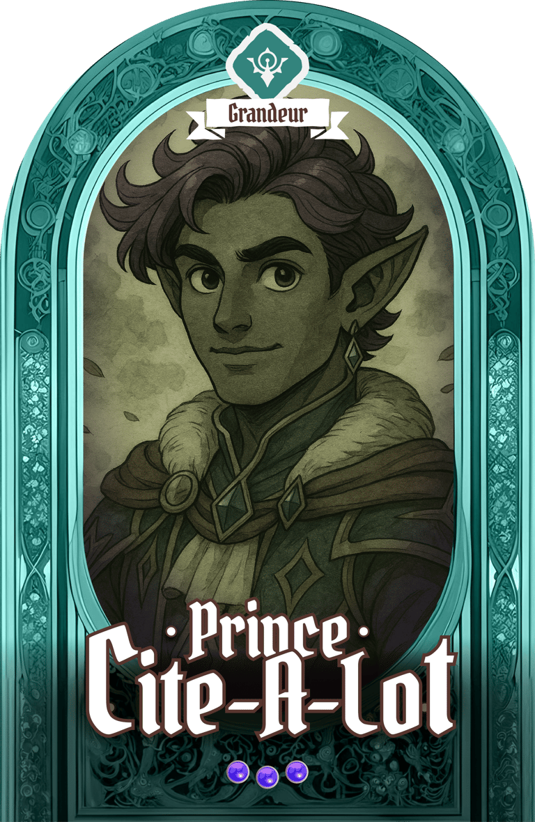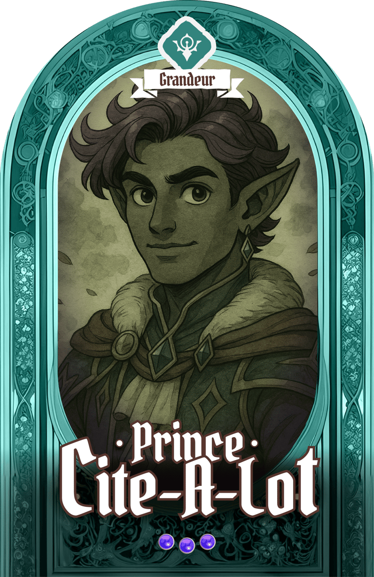 Prince Cite-A-Lot, a regal scholar with twilight-purple hair, embodies the traditions of referencing and intellectual integrity. Gifted with an uncanny ability to recall citations and detect inaccuracies, he upholds the ethics of knowledge with unwavering humility. Childhood studies with Sir Pendragraph forged a lifelong bond, blending scholarship with martial training. Though admired for his wisdom and agility-allowing him to vault over obstacles once per journey-his heart remains burdened by the loss of his sister, Referella. Now, alongside his friend, he seeks to reunite his family and restore the Grand Archive.