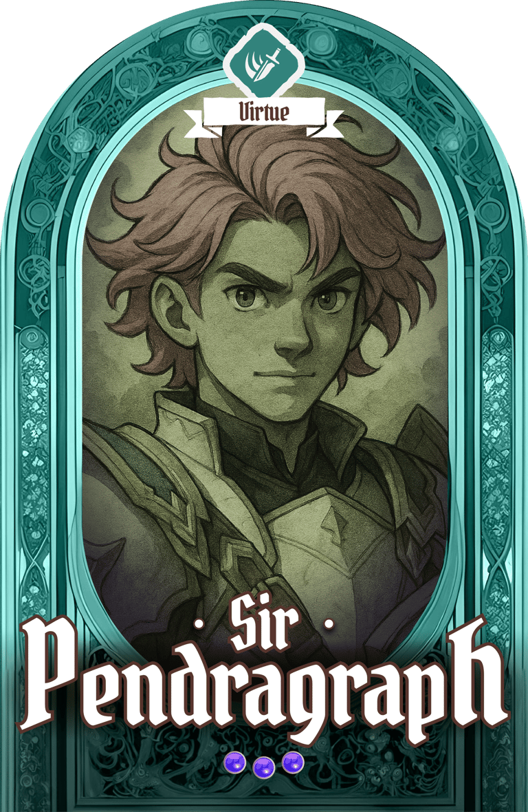Sir Pendragraph, a steadfast knight with dawn-pink hair, embodies justice and truth. Protector of Prince Cite-A-Lot, he wields the Shield of Verification to dispel misinformation and the Sword of Sources to reveal origins of knowledge. A paragon of virtue, he reminds all that "truth is the foundation of justice." He also carries the Die of Destiny, a relic balancing virtue and chance, guiding allies through uncertainty with courage. Though bound by duty, his heart is not untouched by doubt—he knows that even the most righteous path is fraught with difficult choices. He remains unwavering, ensuring that truth prevails.