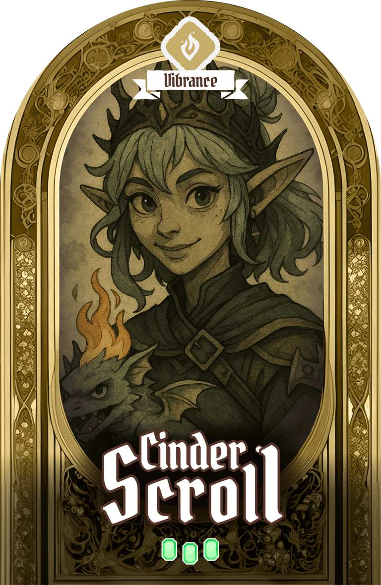 Queen Cinder Scroll, with her emerald hair and smoldering gaze, is both captivating and fierce. Once ruler of the thriving Emberpage, she was betrayed by the Ashenfolio, banished alongside her people, and now burns with a thirst for vengeance. Though impulsive and resistant to scholarly formality, she can summon strategic clarity in critical moments. When moving through Taleterra, she can duplicate collected tokens-but only twice, as her fiery nature often overrides careful planning. With rage as her fuel and defiance as her guide, she fights to reclaim Emberpage from the ashes of betrayal.
