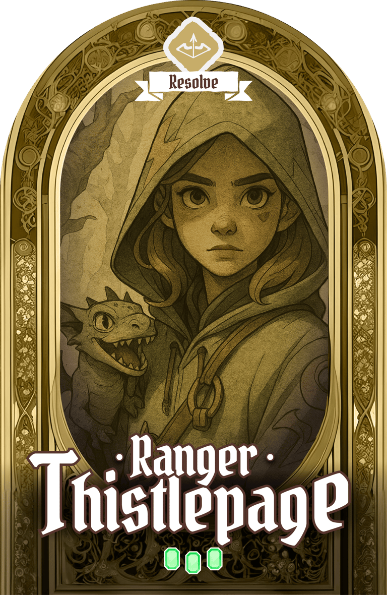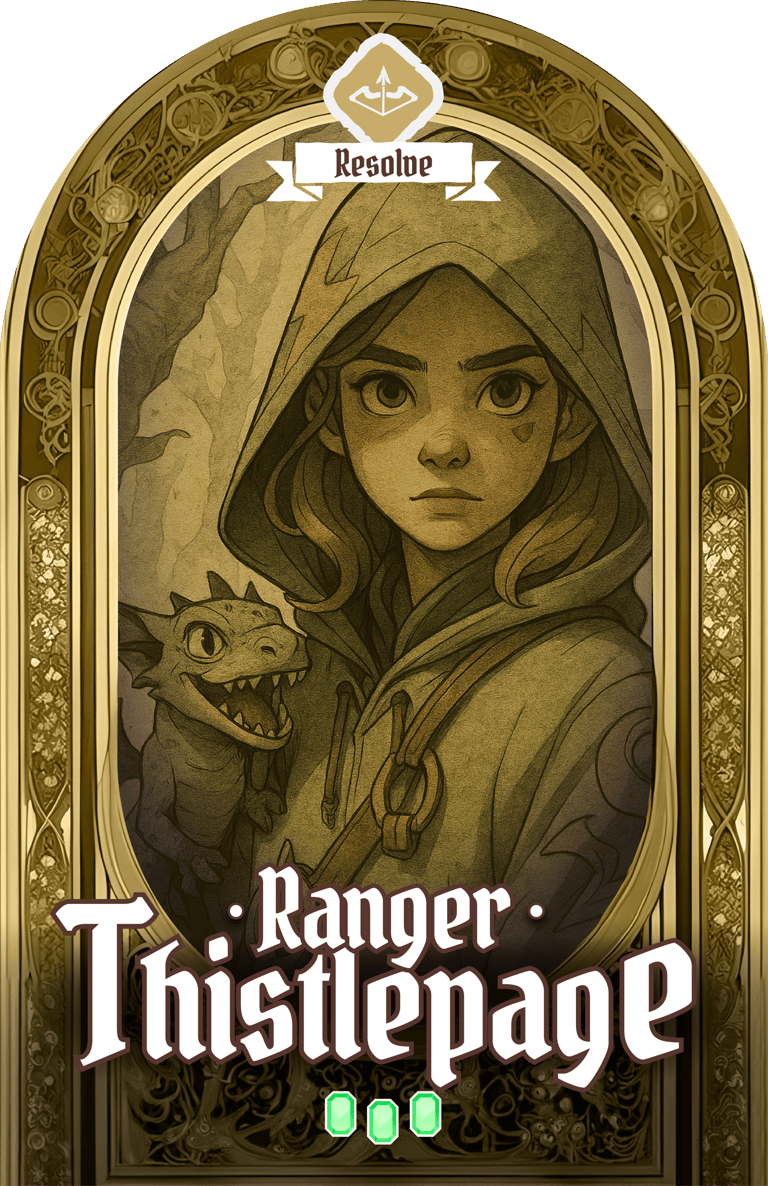 Thistlepage, a hooded archer with piercing icy eyes, was raised in Citehold's rigid order, mastering citation and the language of dragons. Yet, her heart longed for adventure. The Ashenfolio's occupation of Emberpage awakened a fire within her, Resolue driving her to aid Queen Cinder Scroll in restoring their lost homeland. With every lesson in proper referencing, she fought against the erasure of history, ensuring knowledge endured. Her determination allows her to travel farther than any other, moving to an additional environment after taking an action. In her quiver, every arrow is a story reclaimed.